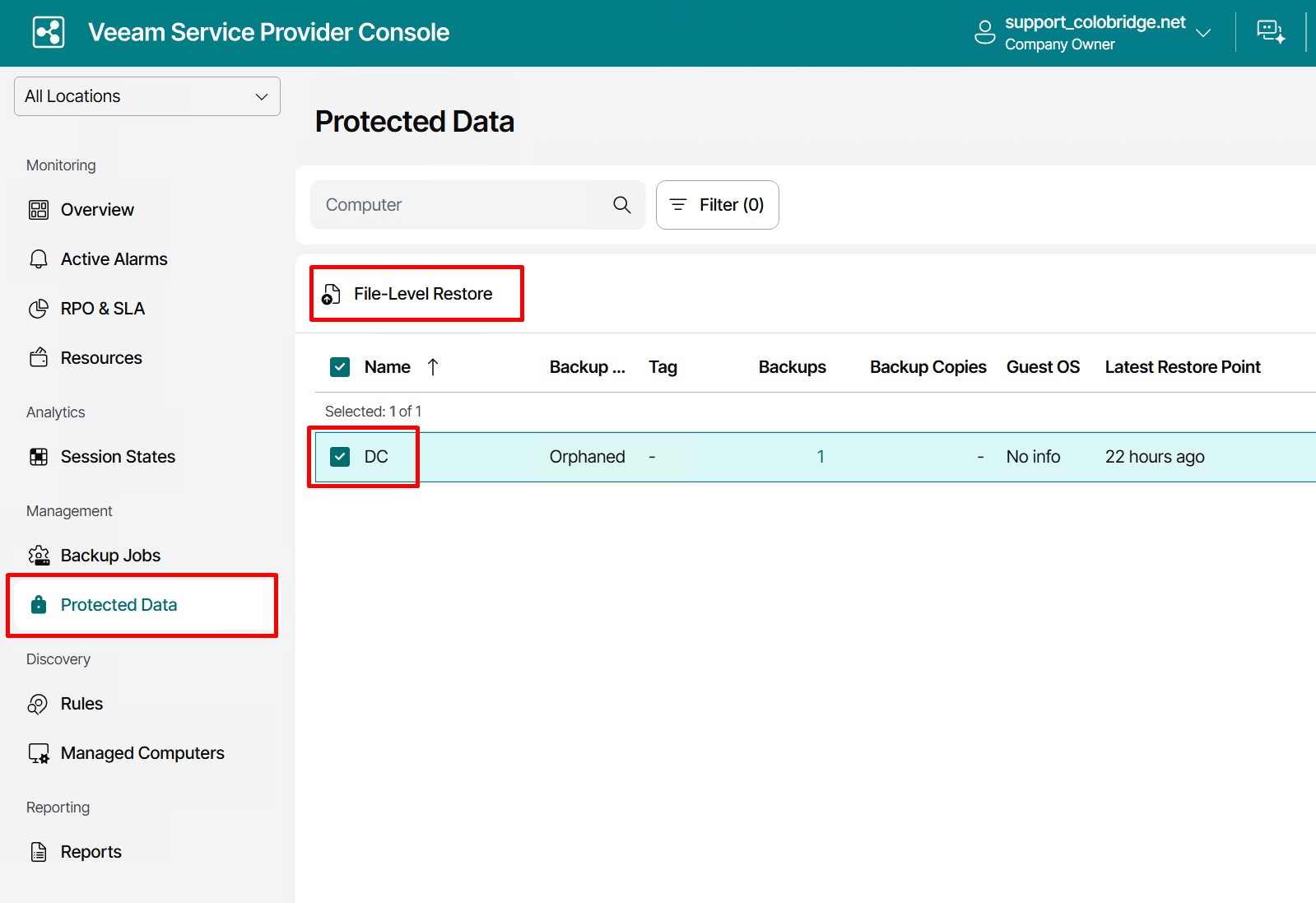 Чтобы приступить к восстановлению, необходимо авторизоваться в VSPC-консоли и перейти в пункт меню Protected Data. Далее необходимо выбрать нужный сервер и нажать File-Level Restore Portal.